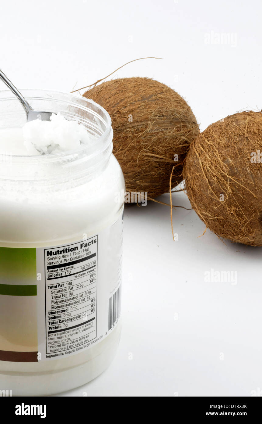 Nutrition Facts Label on Coconut Oil container pictured with two coconuts Stock Photo Alamy